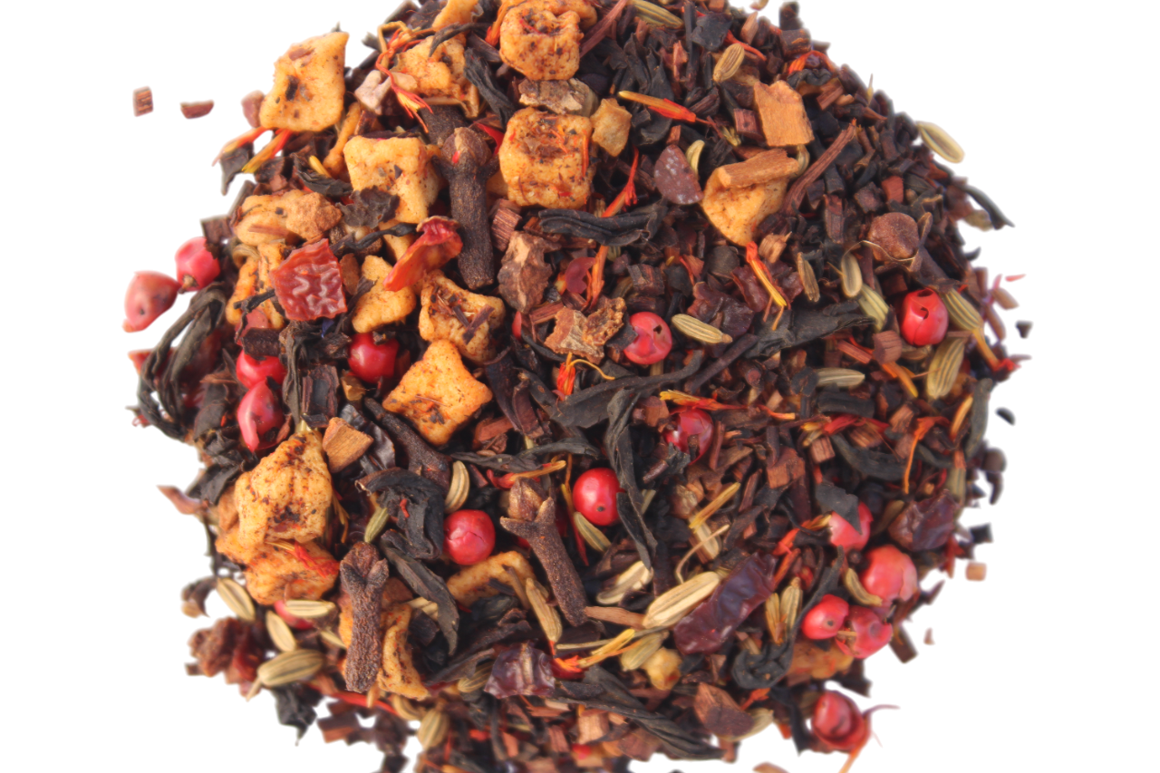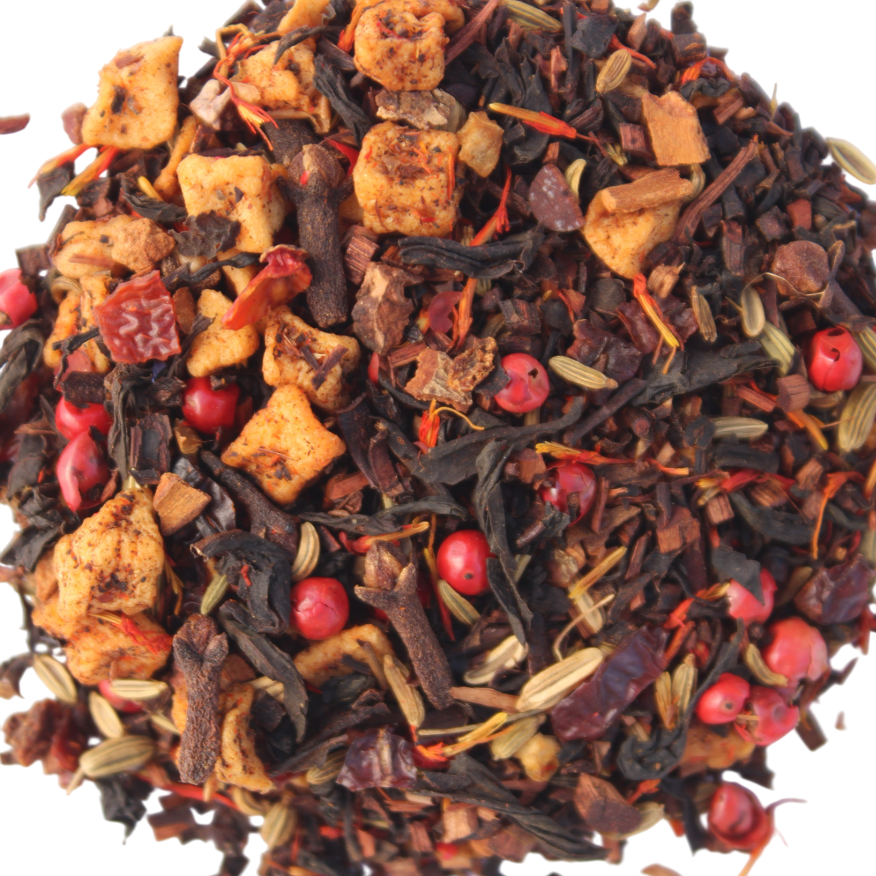 Ingredients: Honeybush Leaves, Apple Pieces, Lapsang Souchong Black Tea, Aniseed, Cocoa Nibs, Cinnamon, Rose Hips, Cloves, Orange, Red Peppercorn, Safflower, Natural Cinnamon Flavor, Natural Hazelnut Flavor, and Natural Orange Flavor