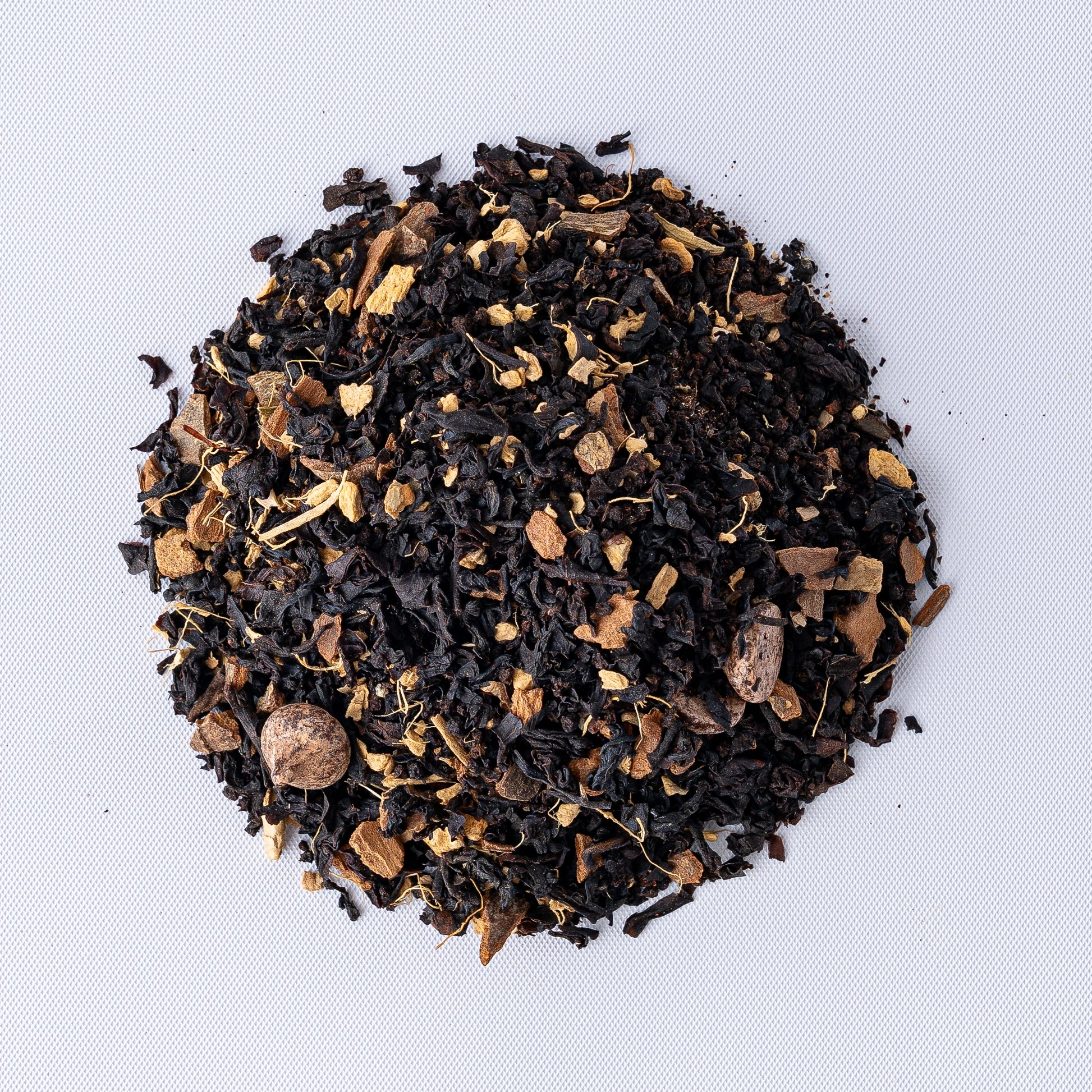 Ingredients: Whole Leaf Black Tea, Organic Cane Sugar, Organic Chocolate Liquor (Cocoa Mass), Organic Cocoa Butter, Ginger Root, Cinnamon Chips, Crushed Green Cardamom, and Chai Flavoring