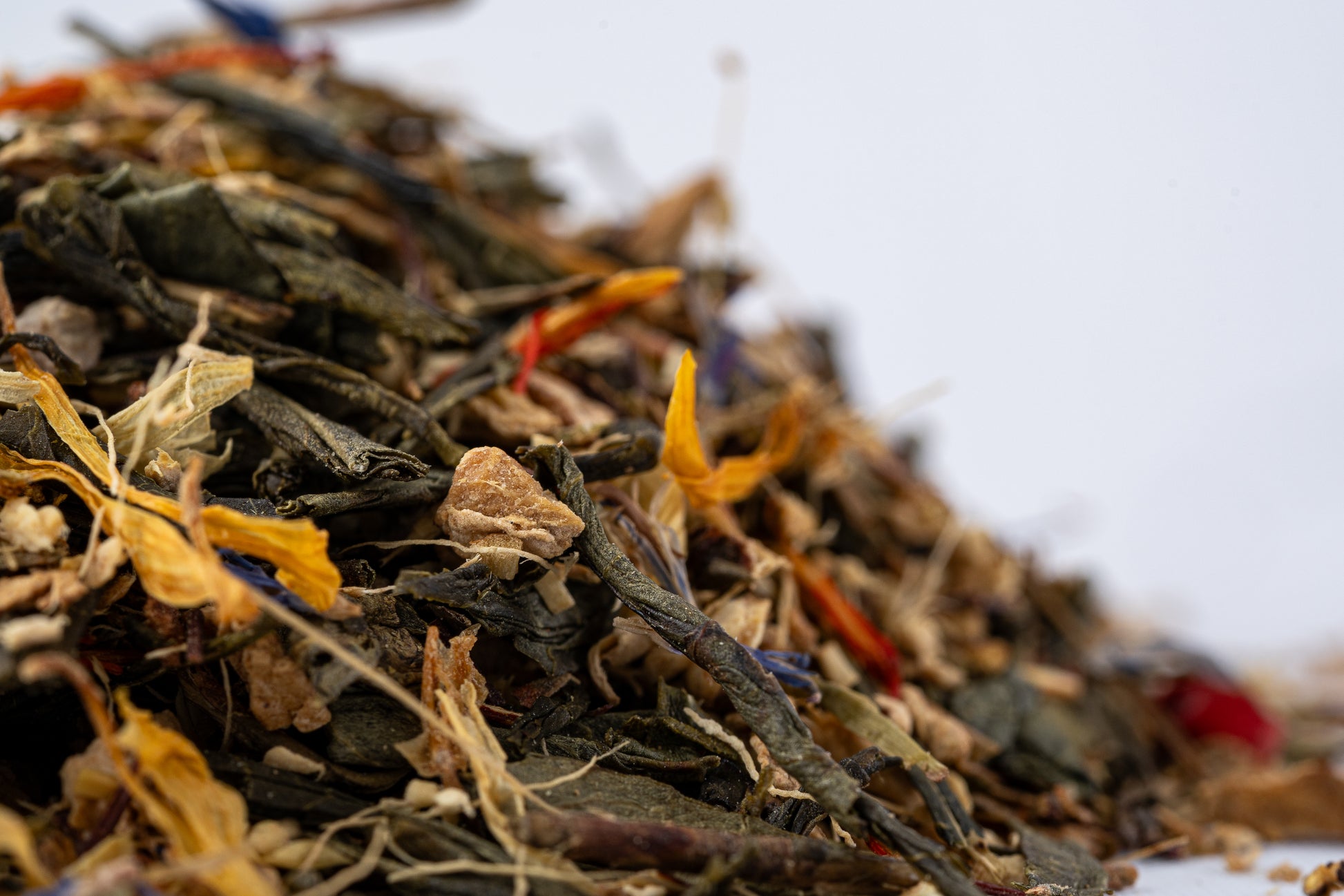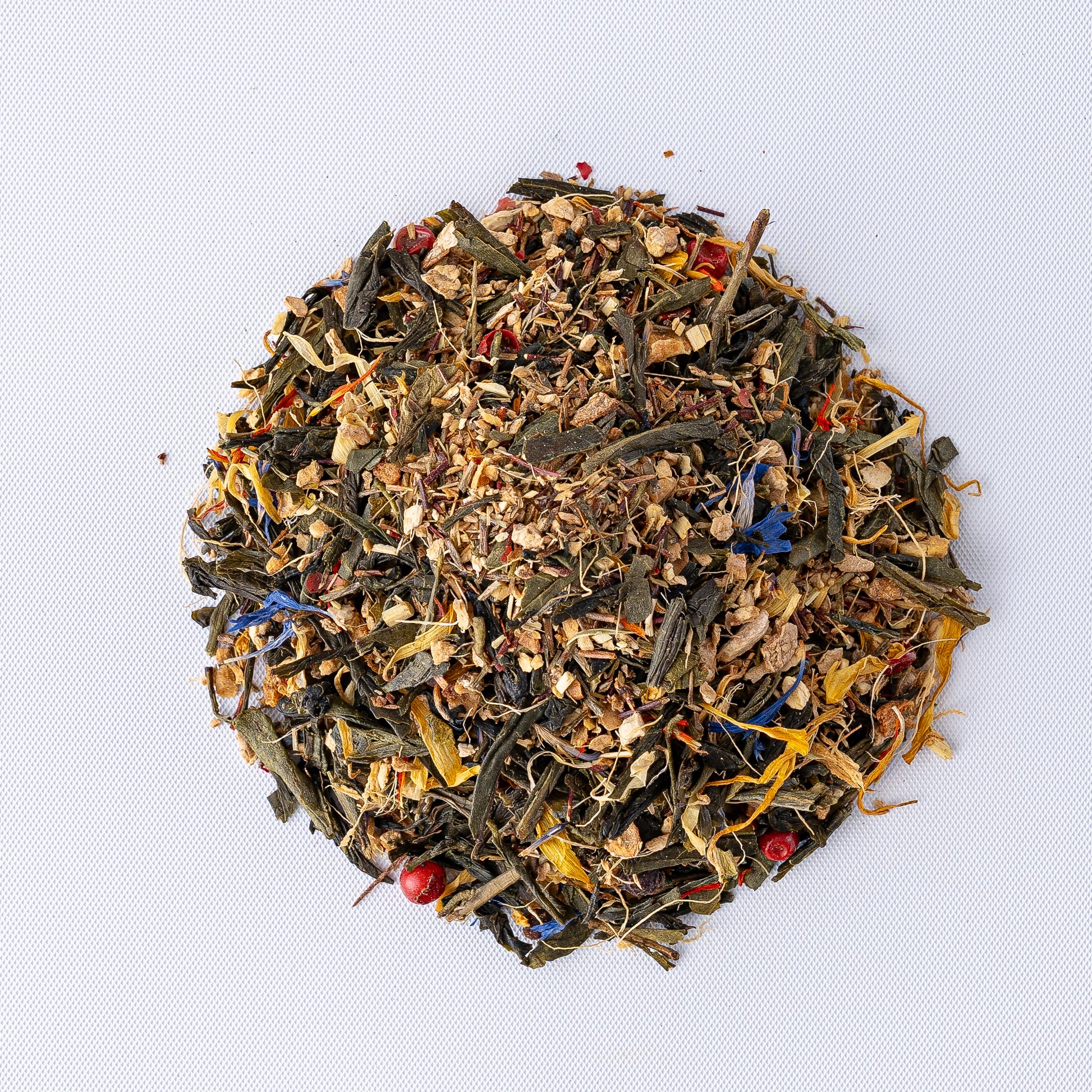 Ingredients: Ginger, Green Rooibos Tea, Red Peppercorn, Natural Ginger Flavor, Black Peppercorn, Orange, Marigold Flowers, Strawberries, Natural Peach Flavor, Natural Strawberry Flavor, Natural Orange Flavor, Whole Leaf Green Tea, Safflowers, Calendula Petals, Cornflower Petals, Natural Mango Flavoring