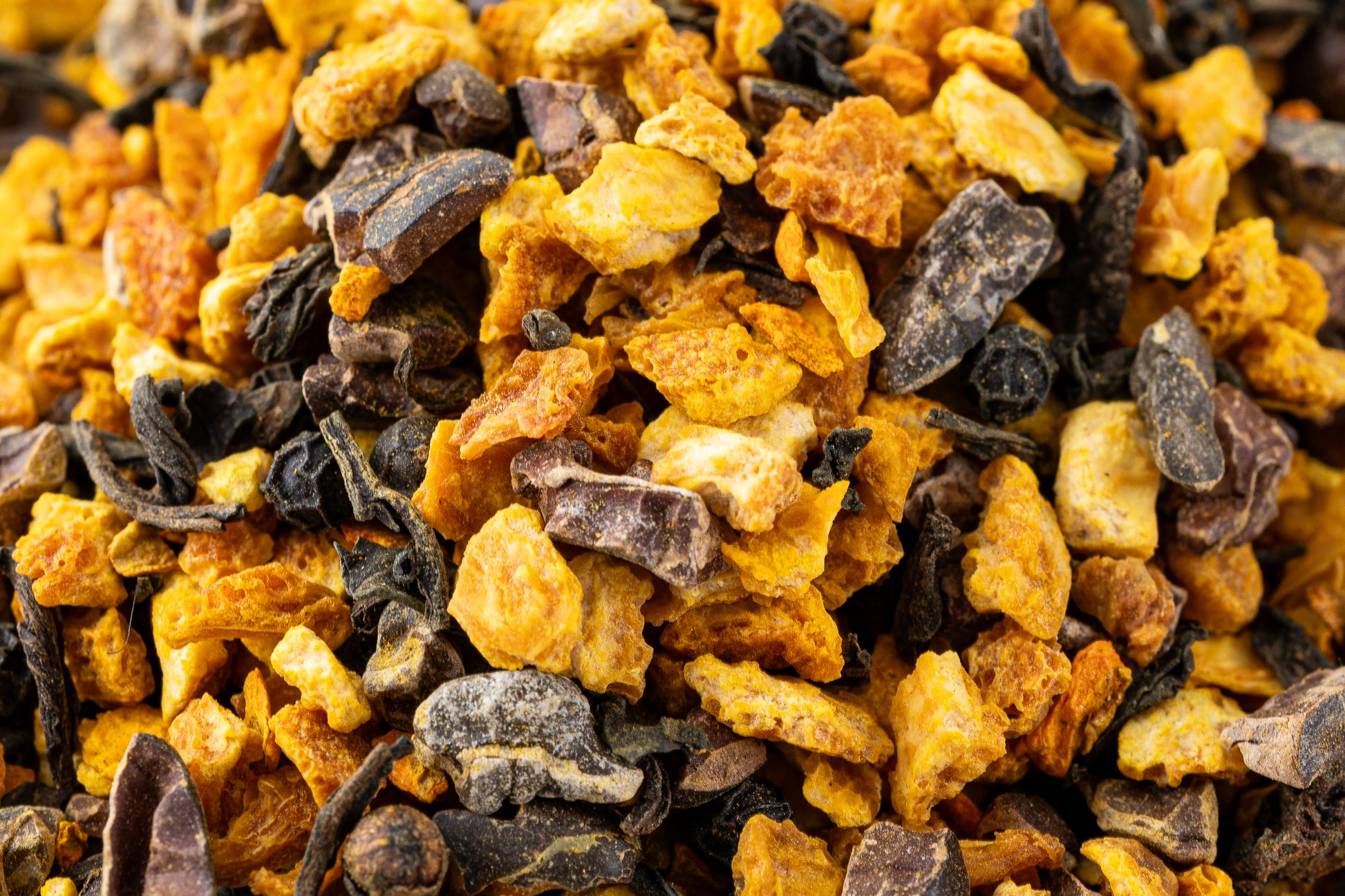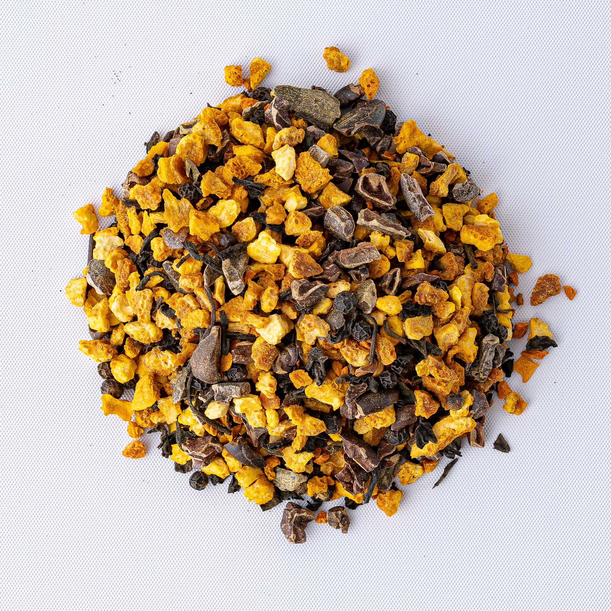 Ingredients: Organic Orange Peel, Organic Cacao Nibs, Organic Pu-erh, Organic Turmeric, and Organic Pepper, with Natural Flavoring