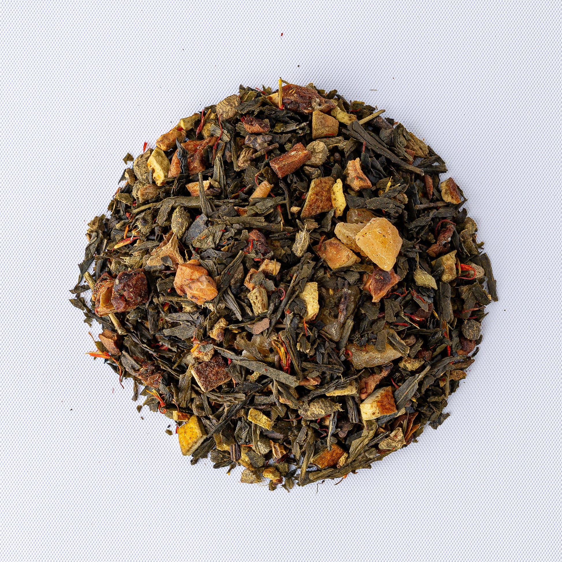 Ingredients: Green Tea, Peppermint, Holy Basil (Tulsi), Spearmint, Rose Hips, Lemon Myrtle, Linden Blossoms, Orange Peel, Ginger Root, Apple Pieces, Safflower, Mango Pieces, with Natural Flavors
